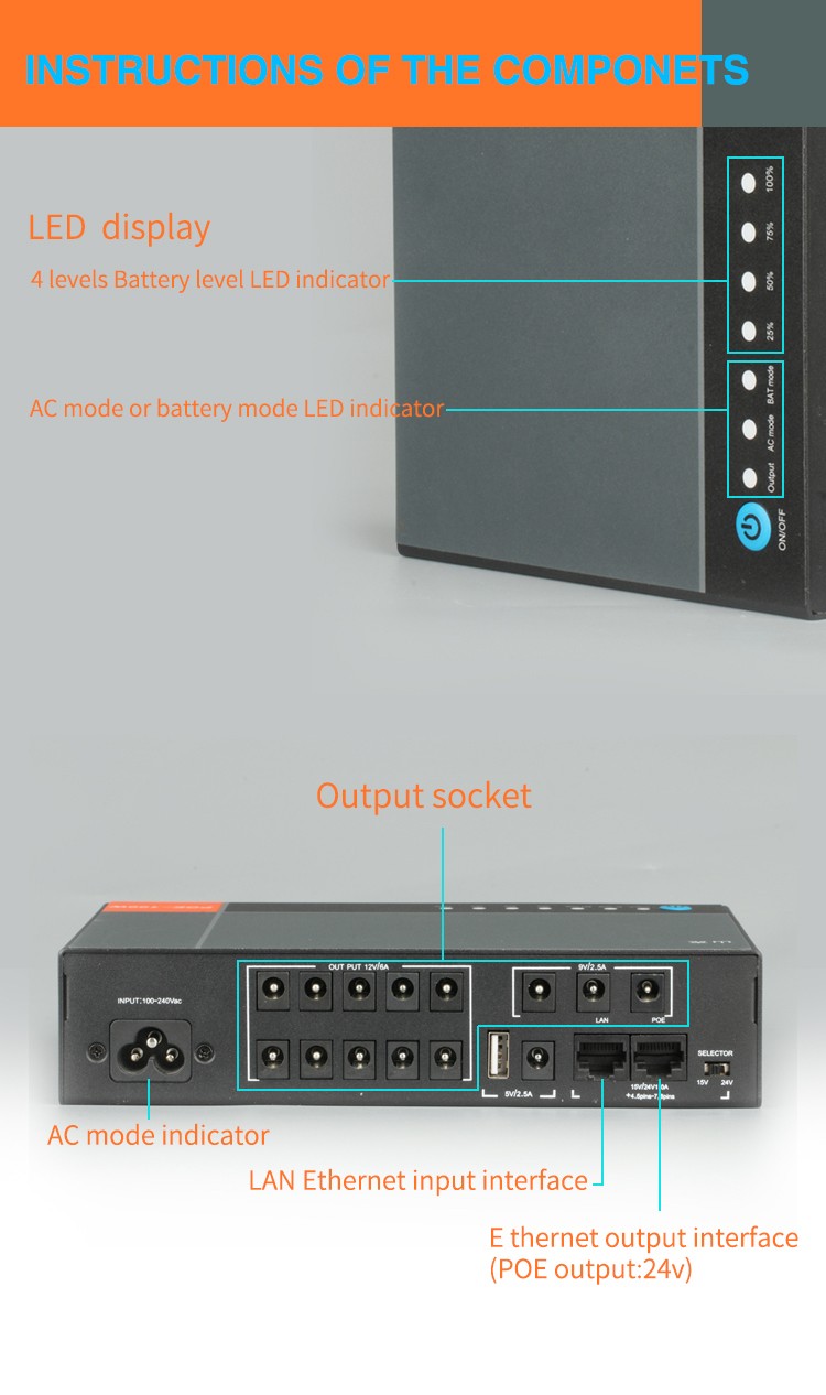POE-110W- Mini UPS 12V 9V 5V POE 1Gb 24V 48V Lithium Battery Mini DC UPS 110W
